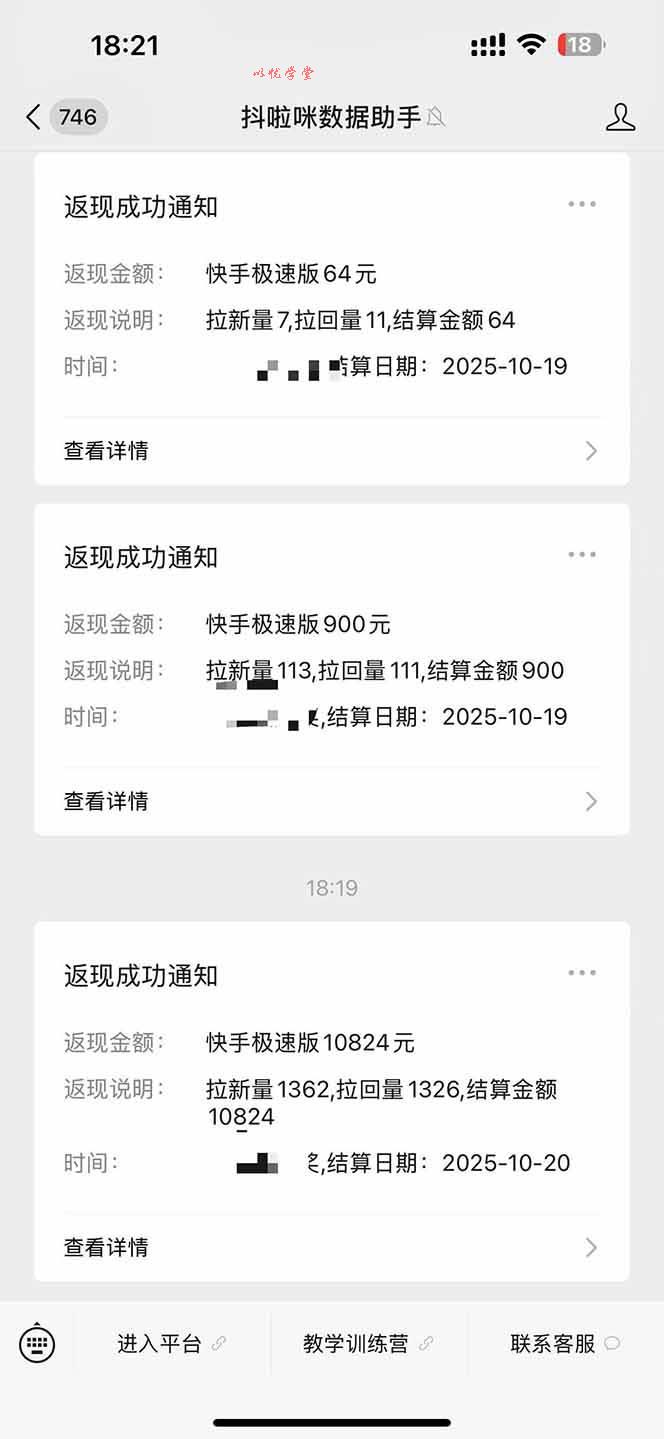 原理很简单,我们做的是快手极速版拉新,只需要在各大平台发布图文或者视频,有转化就有收益。发布的素材我们会提供,也有独家工具给你用,纯小白一学就会,有手机就能做。前几个月玩抖音极速版推广也是同样的玩法,引导用户下载极速版,每天打卡可以领5000红包或者苹果17手机。这种活动更具吸引力。按照我们的玩法每天爆单不停,一天几千甚至5位数都是正常发挥。另外我们对接的是快手官方,次日结算。可以说是做拉新里面结算最快的了,可以放心去推广。目前一单12块左右,咱们不说多,一天拉10单就是日入三位数,按照我们的方法,也不说日入过万,好好做日入几千都是常事。最重要的还是平台结算快,也不用等,每天结算,次日就能提现~
